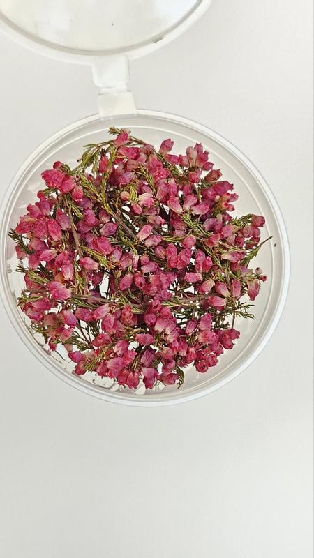Верес еріка сухоцвіт ▫️Колір натуральний ▫️Об'єм контейнера — 50 мл Гілочки яскраво-малинового вересу еріка. Крихітні дзвіночки еріки дуже стильно виглядають у виробах! Вони мають насичений природній колір, який надовго зберігається у виробах з епоксидної смоли. Маленькі листочки на гілочках вереса мають насичений зелений колір 💚 Однією з переваг цієї квітки є її мініатюрний розмір який дозволяє створювати мінімалістичні прикраси у дуже маленьких формах молдів. Жоден поціновувач квітково-епоксидних виробів не встоїть перед бажанням мати цю квітку в своїй колекції. А ще гілочки вересу дуже гарно виглядають у поєднанні з іншими квітами та рослинами у таких виробах як нічники із сухоцвітами або декоративні кульки-галявинки із LED-підсвіткою. Квіти об'ємної сушки, які зберігають свою природну форму та красу підходять до різних видів творчості: прикраси з епоксидної смоли, виготовлення мила та свічок ручної роботи, великих витворів мистецтва з епоксидної смоли таких як меблі та предмети побуту (годинники, вази, підсвічники, декоративні панно та нічники з квітами) 🌿 Glassy Dry Flowers Сухцвіти, які дарують натхнення!