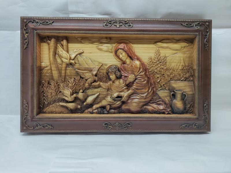 Ікона марія з ісусом годують голубів, ікона з дерева 47х31см