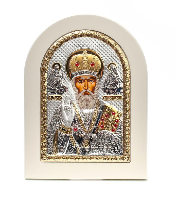 Гречемкая Серебрянапя Икона "Николай Чудотворец" на белом дереве Иконы арочной формы "Николай Чудотворец" в серебреном окладе 925° с позолотой , лик прописанный натуральными красками "темпера" методом шелкографии. Оклад крепиться на деревянной основе белого цвета (МДФ покрытый шпоном ореха) . Икона покрыта специальным лаком, для сохранения первозданного вида иконы. С обратной стороны икона имеет отверстие для того, что бы вешать на стену и откидную ножку, в самых малых размерах ножка вставная. На иконе имеется сертификат и фирменная печать производителя. Икона надежно упакована в оригинальную фирменную коробочку и мешочек. Икона сделана в Греции на иконописной фабрике Prince Silvero по всем канонам православия в старовизантийском стиле. Работаем как по предоплате, так и наложенным платежом, по всей Украине. Уточняйте наличие в размерах. Икона будет незаменимым подарком на любой праздник!!! Производитель: Prince Silvero (Греция)