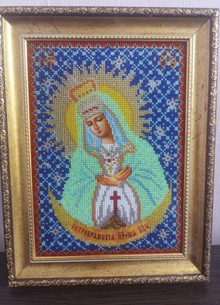 Ікона Остробрамська, вишита чешським бісером в рамці. Розмір ікони з рамкою 25х32. Рамка без скла. Сама вишивка натянута на поролон, тому малюнок наче трішечки випуклий. Та завдяки тому, що немає скла бісер виглядає дуже яскраво. Доставка Укр та Новою поштою.