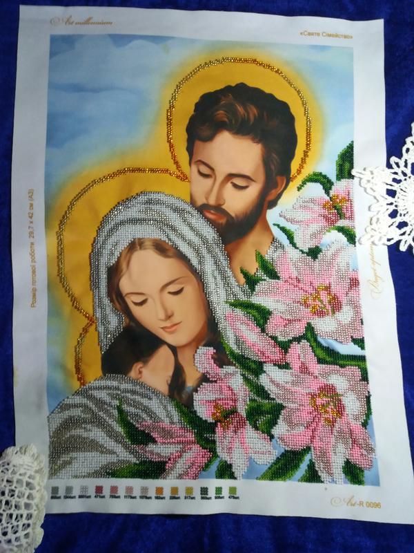 Виробник: Інший виробник Ікона вишита чеським бісером ′Святе сімейство′, на габардині, 11267 бісерин. Вишита ікона якісними полістеровими нитками (TYTAN100) та бісером фірми PRECIOSA (Чехія). Розмір без рамки 42см на 29.7cм .Вишивка без рамки, рамку робите під ваш інтерєр. Ікона символізує взаєморозуміння між подружжям. Образ можна подарувати на одруження, річницю весілля, при новосіллі для молодої сім′ї, а також при народженні дитинки