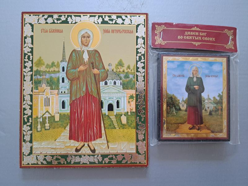 ікона святої Блаженної Ксенії Петербурзької, однієї з найбільш шанованих православних святих. Блаженна Ксенія Петербурзька жила у XVIII столітті в Санкт-Петербурзі. Після смерті свого чоловіка, капітана Андрія Петрова, прийняла на себе образ "юродивої заради Христа" — носила одяг покійного чоловіка, називала себе його ім’ям, відмовилась від особистого майна й жила на вулицях міста. Люди вважали її дивакуватою, але згодом стали бачити в ній святу — її молитви допомагали людям, вона пророкувала, зцілювала та допомагала в бідах. Значення ікони: Свята Блаженна Ксенія — заступниця всіх, хто знаходиться в нужді, шукає життєвого шляху, потерпає від горя, бездомності чи самотності. До неї моляться про здоров’я, шлюб, дітей, житло, роботу й у важких життєвих обставинах. На іконі Ксенія часто зображується босоніж (як знак її смирення) на тлі Смоленського кладовища, де вона жила і де зараз знаходиться її капличка-могила — місце паломництва. Напис над іконою ліворуч: "Свята блаженна Ксенія Петербурзька", а справа на пакуванні — "Дивен Бог во святих Своїх", що підкреслює шанування святих як носіїв Божої благодаті. ціна за 2шт розмір більшої 11х13,5см