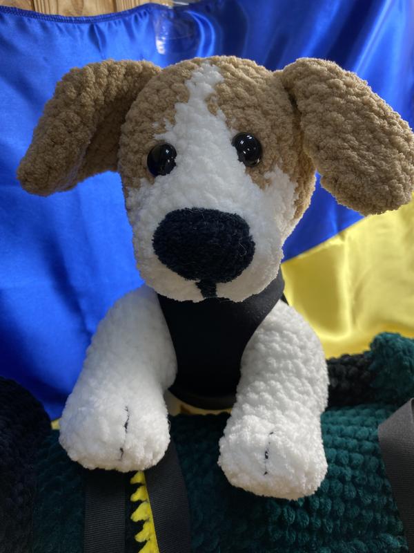 Сьогоднішній улюбленець всіх українців, захисник нашого спокою, допоможе кожному обминути життєві труднощі)) м′якенький але мужній пес Патрон. Зв′язаний з любов′ю та вірою у накнайшвидшу перемогу. Використана плюшева пряжа, наповнювач холофайбер, пластикові очки-гудзики, носик вишитий, бронежилет можна знімати, коли песик на відпочинку)