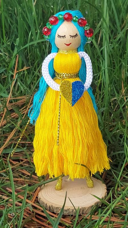 Эта декоративная куколка украсит ваш дом и добавит хорошего настроения! Так же кукла может стать милым подарком для ваших близких и друзей. Кукла маленькая и изысканная, может обжиться на комоде, на столе или на полочке. Хороший выбор для коллекционеров! Выполнена в жёлто-голубом цвете (символ украинской несокрушимости). Размер: 13 см. Время изготовления: 1 - 2 дня. Условия оплаты: предоплата 100%. Материал: проволока, нитки, бусины. Уход: как истинной леди, нужно время от времени поправлять причёску, одежду (особенно после доставки!). Не мочить! Не ставить рядом с горячим! Одежда не снимается! Вещь ручной работы, поэтому цвет, аксессуары, причёска могут не существенно отличаться. Кукла не является игрушкой, не предназначена для маленьких детей (присутствуют мелкие детали!). Идёт в подарочной коробочке!