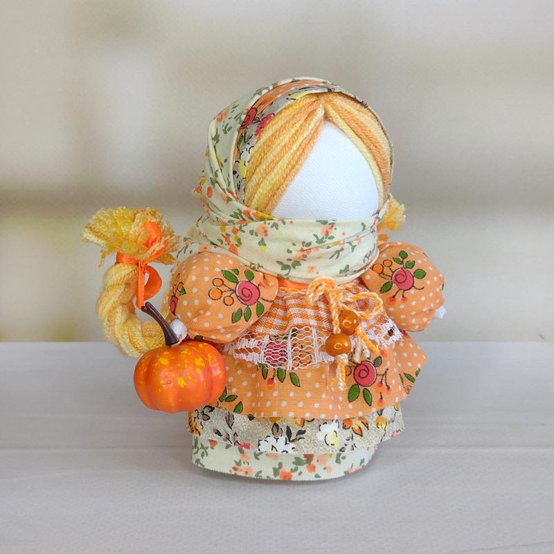 Маленька Берегиня з гарбузиком та великим сенсом. Гарбуз уособлює родючість і достаток. Його кругла форма і багатий врожай символізують повноту життя, щедрість природи і добробут. Гарбузи часто використовувалися як декор під час святкувань збору врожаю. Завдяки великій кількості насіння гарбуз асоціюється з багатодітністю, продовженням роду і сімейними цінностями. У цьому контексті гарбуз виступає як символ родинного щастя і гармонії. Гарбуз вважався дуже корисним продуктом, багатим на вітаміни і поживні речовини. Він символізував здоров'я і довголіття, що знаходило відображення в народних повір'ях і звичаях. В українському фольклорі гарбуз також міг слугувати оберегом. Його використовували для захисту дому та родини від злих сил і негативного впливу. Вважалося, що гарбуз здатний відганяти нечисту силу і приносити в дім позитивну енергію. Гарбуз часто згадується в українських народних піснях, казках і приказках, де він може символізувати як побутові реалії, так і глибші культурні смисли. Зріст лялечки 12 см.