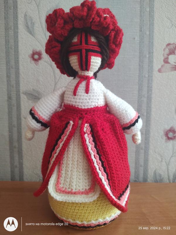 Традиционная украинская кукла-обхранг. Символизирует гармонию, защиту и истинную силу, служит оградом для дома и семьи, даря мир, благополучие и защиту от зла. У мотанок нет лица, символизирующего его семью и отсутствие связи с конкретным человеком. Это делает ее универсальным оградом для всех поколений. Сделанная с любовью, мотанка становится надежным защитником и талисманом на долгие годы. Высота мотанки - 27 см, венчик снимается. Может связать в любом цвете, обратитесь. На выполнение 4-5 дней.