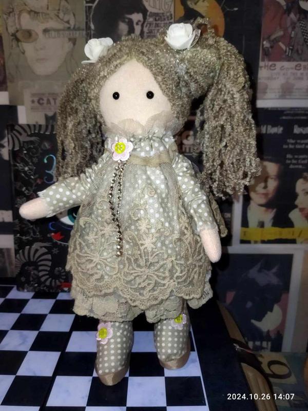 Інтер'єрна текстильна лялька ручної роботи висота 29 см ширина — 12 см для дітей від 3 років Ручки та ніжки рухливі. Одяг не знімається. Вміє стояти й сидіти