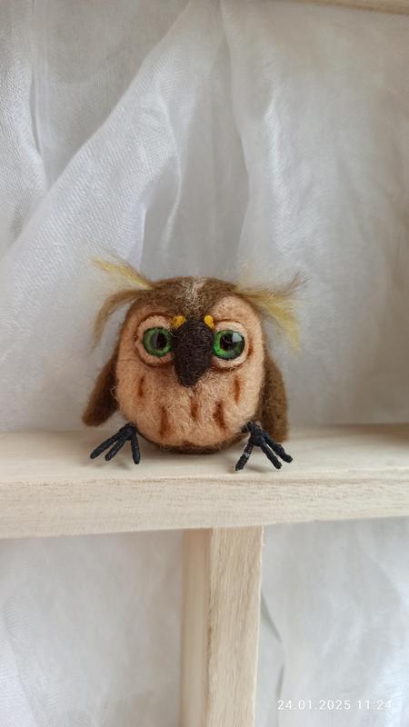 Малесеньке совеня Кеша,зроблене вручну з вовни,висота 4,5 см.Інтер'єрна іграшка.На другому фото всі три совеня Кірюша,Мотя,та Кеша,яких я продаю.