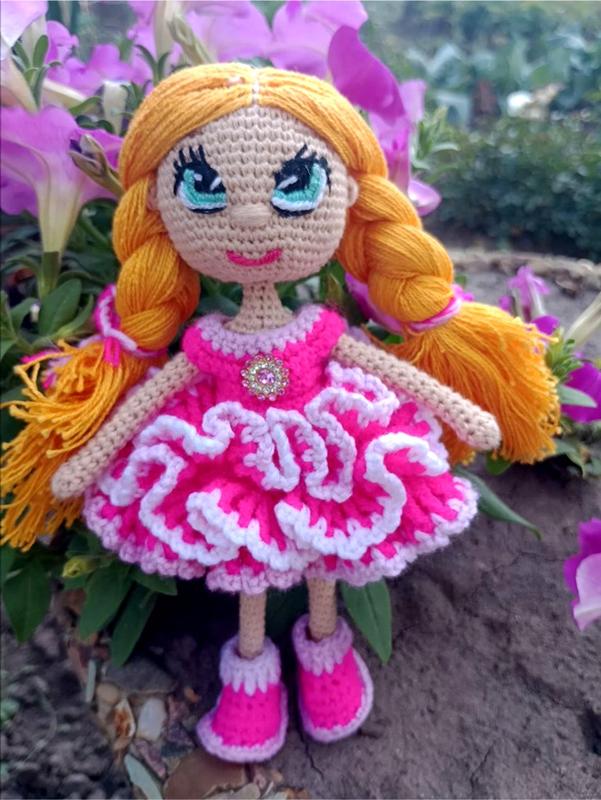 Чарівна лялечка ручної роботи, створена в техніці амігурумі. Яскраве вбрання та великі вишиті оченята надають їй особливого шарму. Ідеальний варіант для подарунка або як елемент декору. 🔸 Висота: 20 см 🔸 Матеріал: акрилова пряжа, бавовна 🔸 Наповнювач: холофайбер (гіпоалергенний) 🔸 Очі: вишиті вручну (безпечні для дітей) 🔸 Техніка: гачком, ручна робота 🔸 Вбрання: яскрава рожево-біла сукенка з об’ємними воланами, взуття та прикраса на грудях (усе в’язане) 💖 Лялечка легка, м’яка, ідеально підходить для гри, фотосесій або подарунка до свята.