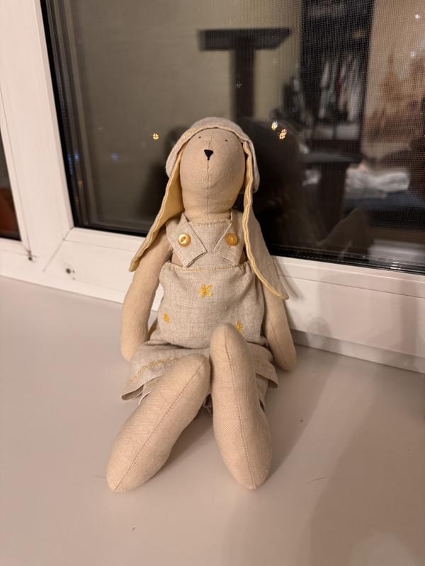 Ніжна лялька-тільда у вигляді зайчика, виконана з льону та бавовни. Одягнена у лляну сукню з вишивкою жовтими нитками й ґудзиками, має довгі вушка та лагідний вигляд. Іграшка сидить самостійно — стане гарним елементом декору дитячої кімнати або теплим подарунком близькій людині. Матеріали: льон, бавовна, наповнювач — гіпоалергенний холофайбер Розміри: висота сидячи 25 см, ширина 15 см Стан: новий, ручна робота Кожен шов зроблений з увагою до деталей — це унікальна робота, що зберігає тепло рук майстра.