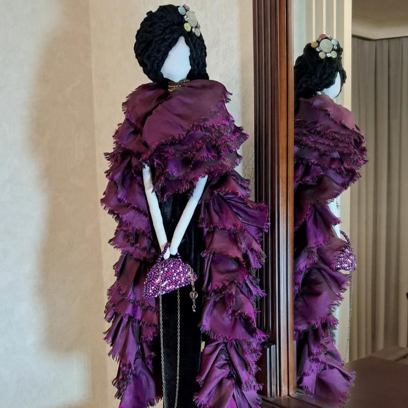 Имя: Дева Марселла 🌹 Дата рождения: 12 ноября Рост: 56 см Основание: деревянная подставка Перед вами – интерьерная кукла “Дева Марселла”, настоящая театральная муза в бархатном платье и роскошном фиолетовом бое, напоминающем о эпохе больших сцен и громких оплесках. Ее образ – это сочетание загадочности, утонченности и артистической натуры. Она будто только что вышла из сцены старого театра, где еще звучит музыка и пахнет парфюмом прошедшей эпохи. Марселла - женщина настроения. Она любит внимание, свет рампы и роскошь в мелочах. Ее маленькая сумочка, украшенная бисером, - как символ женского шарма и тайны. Эта кукла станет эффектным акцентом в любом интерьере, особенно там, где ценят эстетику, искусство и характер. Авторская работа Ирины Зиник.