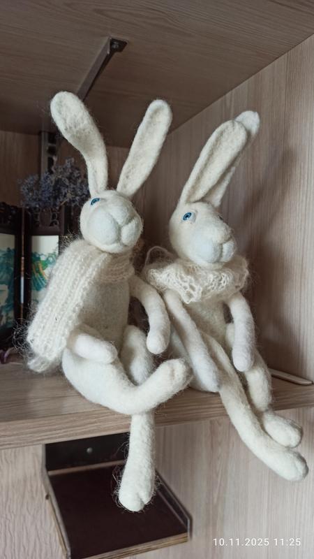 Ця чудова парочка Пух та Сніжок зроблять вашу оселю стильною та затишною.Чудова нагода прикрасити свій дім інтер'єрними повстяними фігурками.Чудовий подарунок друзям та близьким.Висота зайців-24 см.
