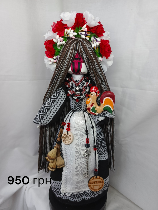 Авторська лялька мотанка , ручної роботи з натуральних тканин.Мотанка давній родинний оберіг.Сакральний хрест на обличчі,який є символом Сонця,єнергії,поєднання чоловічого та жіночого,захистом від негараздів.Висота ляльки від 33 см ,ручки гнучкі.Стоїть самостійно на дерев'яній основі.Лялька стане окрасою вашої оселі або чудовим подарунком для ваших рідних та близьких.Український оберіг.