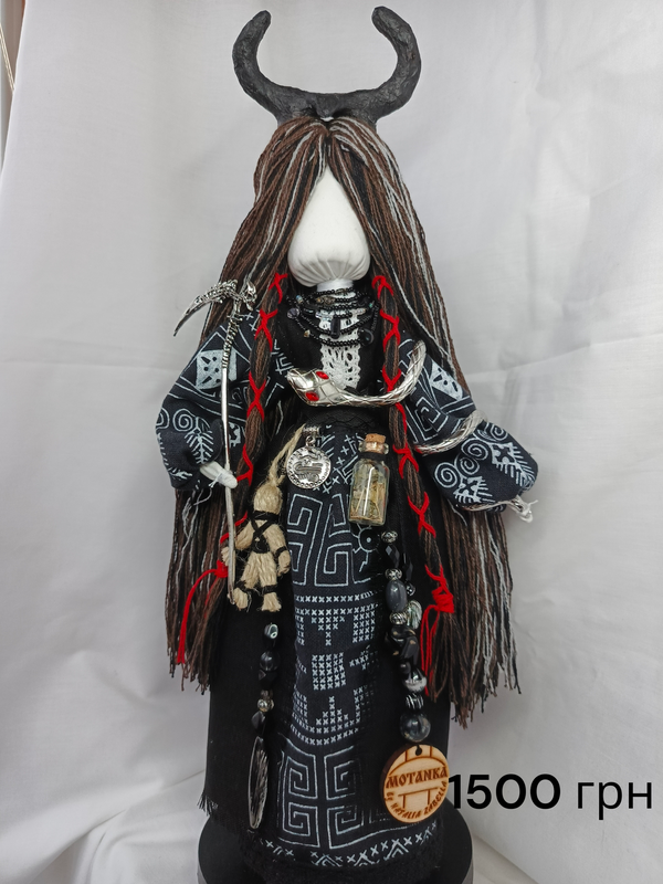 Авторська лялька мотанка , ручної роботи з натуральних тканин.Мотанка давній родинний оберіг.Сакральний хрест на обличчі,який є символом Сонця,єнергії,поєднання чоловічого та жіночого,захистом від негараздів.Висота ляльки від 33 см ,ручки гнучкі.Стоїть самостійно на дерев'яній основі.Лялька стане окрасою вашої оселі або чудовим подарунком для ваших рідних та близьких.Український оберіг.