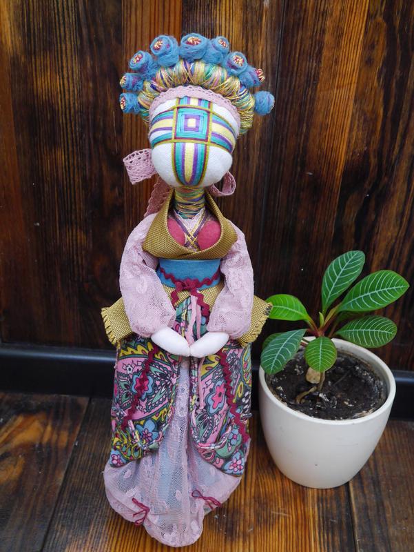 Унікальна інтер'єру єрна лялька в національному стилі, зроблена майстринею, в єдиному екземплярі. Текстильна, на стійкій дерев'яна яній підставці. Акуратно зроблена, стоїть гарно, не банальна і стильно, чудовий підбір кольорів, виглядає дуже красиво в будь якому місці. Може бути чуовим подарунком , прикрасою вашої оселі або офісу. В ідеальному стані. Висота 38 см