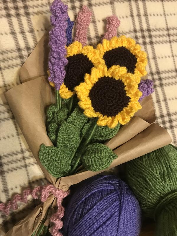 Чарівні соняшники (3 шт) та лаванда (6 шт). Кількість квіточок і забарвлення - за вашим бажанням, може бути будь-якими. В'яжу на замовлення. Замовляйте, будь ласка, заздалегідь (за 2 тижні до відправки). Відправляю зі Львова. Передоплата 50%, решта 50% оплати - перед відправкою. Якщо від замовлення відмовляєтеся, то гроші, вибачте, не повертаю.