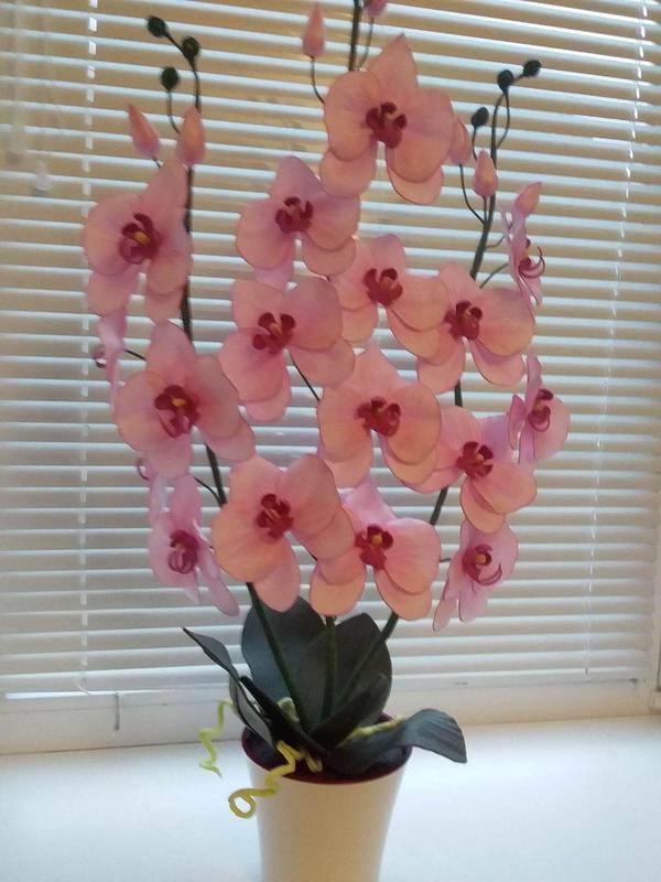 Хто бажає постійно квітучу орхідейку? Не потребує поливу, проста в догляді, можна мити під душем при потребі. Квітку виготовлено з фоамірану та ізолону, тоновано пастеллю. Висота - 67см У амазонському повір`я красуня богиня носила ім`я Орхідея. Значення квітки пов`язують з цією красивою легендою. Вона оповідає про богиню світла, яка вважала за краще зберегти свою любов і переселитися рослиною в світ людей. Так з`явився дивовижний квітка - орхідея. Значення квітки - це любов і ніжна пристрасть. Такі квіти презентують партнерам по бізнесу або товаришам по службі. Їх можна дарувати не тільки жінкам. Чоловікові буде приємно отримати такий презент. Освідченням у коханні і палкої пристрасті будуть орхідеї ніжних світлих відтінків. По вашому замовленні створемо таку квітку в вазоні, яка буде квітнути круглий рік, на відміну від живих. Їх практично від живих і не відлічиш Висота орхідеї в вазоні -71 см. Орхідея - квіти матеріал фоаміран, листи орхідеї - ізолон. Матеріал не визиває алергії.