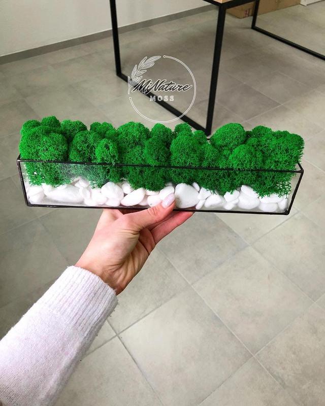 MiNature Moss - це студія вертикального озеленення стабілізованим мохом та рослинами. Моссаріум зі стабілізованим мохом затребуваний товар, який зробить акцент у вашому інтер'єрі, додасть свіжості, унікальності. Також моссаріум стане відмінним подарунком для рідних, близьких, колег, друзів та здивує абсолютно кожного! Колір моху натурально зелений, А класу Матеріал форми: скло Розмір: довжина 30 см, висота 6см (з мохом 12-13 см), ширина 6 см Стабілізований мох-це справжня знахідка, адже за ним не потрібно доглядати, від слова зовсім. Переваги моху: -зберігає насичений колір та природну м'якість від 5ти до 10ти років -гіпоалергенний; -має антистатичну поверхню (за рахунок гліцеринового розчину в якому він вимочується, пил на ньому не накопичується) -його не потрібно обприскувати, поливати; -не вимагає освітлення; -в ньому не заводяться комахи, різні шкідники та цвіль Головні поради для продовження терміну експлуатації моху: - не мох під пряме сонячне проміння якщо мох щоденно світитиме сонце, він швидко вицвіте - не мочіть і не обприскуйте водою якщо мох намочити то з поверхні змиється розчин, таким чином він буде сохнути і втрачати колір - Підтримуйте вологість повітря 30-70% вологості якщо вологості у приміщенні недостатньо, її можна підвищити зволожувачем повітря - Забирайте пил з поверхні раз на 4-6 місяців делікатним рухом щіткою для пилу або холодним струменем повітря фена У нас ви отримуєте: _Найкращу ринкову ціну _Якісний продукт _Детальну консультацію _Надійні упаковки _Стильний декор, який нікого не залишить без уваги Ручна робота яку ми робимо якісно, надовго!