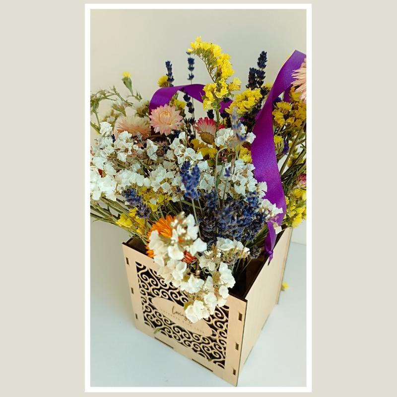 Композиция из натуральных цветов - сухоцветов. Сушеные цветы сохраняют свою декоративность а протяжении длительного времени, поэтому ваш подарок станет прекрасным украшением дома или офиса. Натуральная плетеная корзинка ручной работы наполнена цветами Амобиума, напоминающими своей окраской и формой ромашки. Композиция дополнена разноцветными вкраплениями других цветов именно поэтому похожа на весенний цветущий луг. * Композиция создается на основе натуральных цветов, каждый букет будет уникальным и несколько отличаться друг от друга. * Размер корзинки 25/15/10 см * при транспортировке допускается обсыпание отдельных лепестков. Для приветствия дополните букет открыткой!
