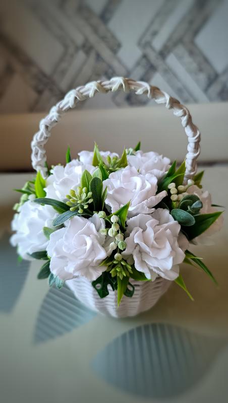 Букет білої гарденії з мила ручної роботи у плетеному кошику
