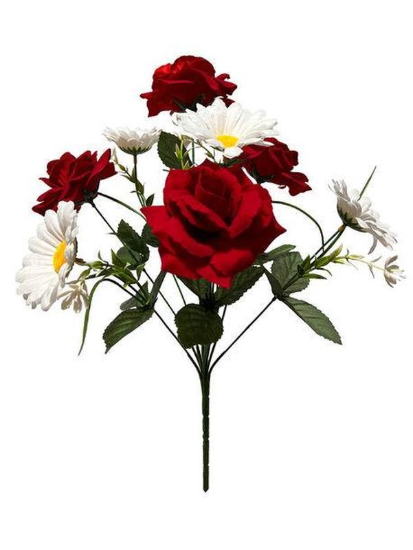 Кілька примірників у наявності Штучні квіти Букет Ромашки та Троянди оксамит, 9 голів, 500 мм, червоний із білим Продається гуртом і в роздріб із доставкою Украине Країна виробник: Китай Матеріал стебла: Пластик Матеріал квітки: Тканина Колір: Різні кольори Стан: Новий Виробник: китай