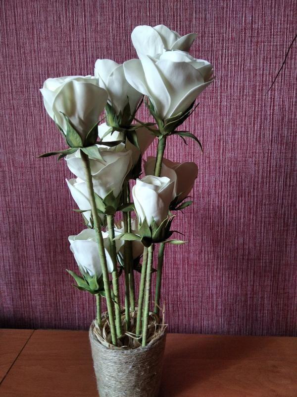 Інтер'єрна композиція - білі троянди. Матеріал виконання - фоамиран. Висота 25 см, ширина 10-12 див. Ніяких вимог до догляду. Ідеально підходить для людей, яким колись доглядати за живими квітами.