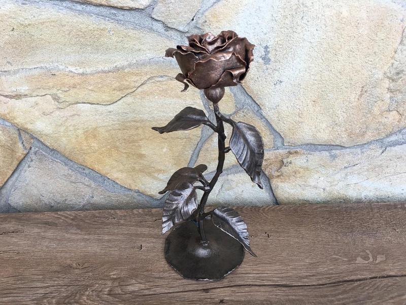 Шукаєте гарний подарунок на Різдво? Подарунок на річницю весілля? Подарунок на день Святого Валентина? Весільний подарунок? Чи просто декор для дому? Ось кована металева троянда, яка може стати чудовим подарунком для вашої дівчини/жінки. Виглядає дуже святково і декоративно! Вона точно стане вишуканим акцентом будь-якого свята. Розміри: висота - 31,5 см довжина - 15 см ширина - 15 см діаметр підвалу - 11,5 см вага - 0,7 кг Ця троянда виглядає дуже об'ємно та декоративно, майже як справжня. Бутон виконаний у яскравій бронзі, а стебло і листя мають темно-бронзовий відтінок, що додає святковості вашому інтер'єру.