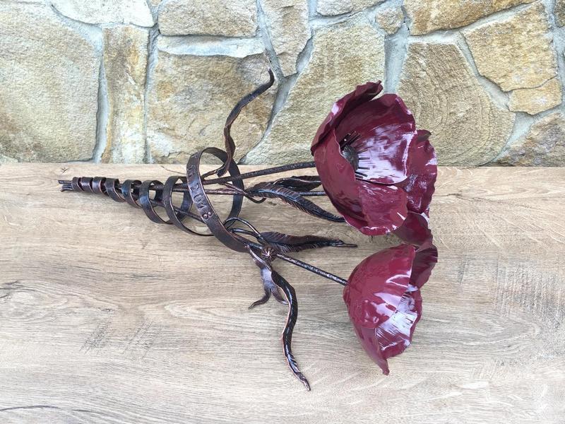 Ви любите квіти, особливо маки? Цей власноруч кований букет із трьох маків стане чудовим подарунком або чудовим декором для вашого дому. - Тип: Ручно кований букет із трьох маків, з'єднаних кованою металевою стрічкою з гравіюванням (індивідуальна гравіювання доступна). - Розміри: Довжина - 60 см, Ширина - 30 см, Висота - 30 см - Розмір бутона: 14 см х 14 см - Матеріал: Кований метал - Колір: Бутони маків червоні; стебла, листя та стрічка чорні з мідним нальотом - Вага: 2 кг Цей букет вражає поєднанням кольорів та вишуканістю виконання. Він буде чудовим подарунком на весільну річницю, день народження, День матері або будь- яку іншу особливу подію. Також він стане відмінним декором для вашого дому, додаючи йому елегантності та унікальності.