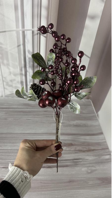 Декоративна гілка складається з листя з бордовими перламутровими ягодами та шишкою. Гарно та оригінально доповнить будь-який інтер'єр, як святковий, так і повсякденний. Висота - 41см