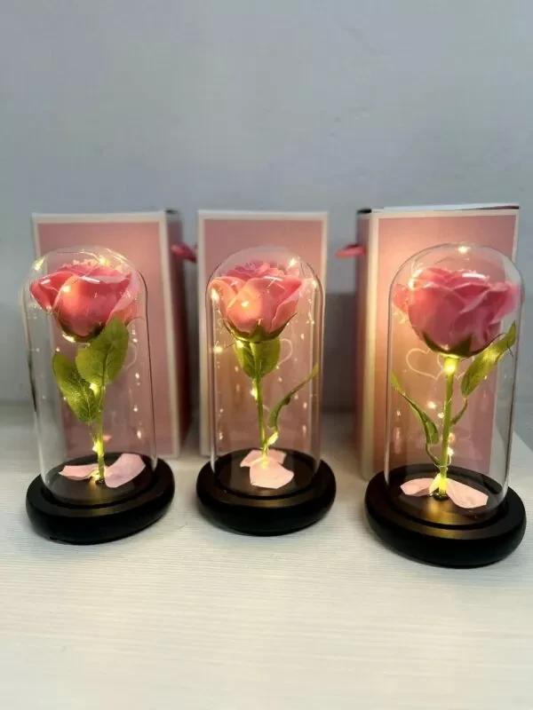 Характеристики та опис Троянда в колбі — це символ любові, сили та мужності Троянда в колбі з підсвіткою — чудовий подарунок, що несе в собі глибоке значення. Троянда стане не тільки приємним сюрпризом, але й вишуканим доповненням до будь-якого стилю інтер'єру — від класики до мінімалізму. Лаконічне виготовлення та квітка під прозорим куполом ідеально впишуться в будь-які умови, ставши його контрастною прикрасою. - Матеріал: пластиковий. - Колір підставки: чорний. - Колір троянди: рожевий. - Живлення: 3 батарейки (входять до комплекту