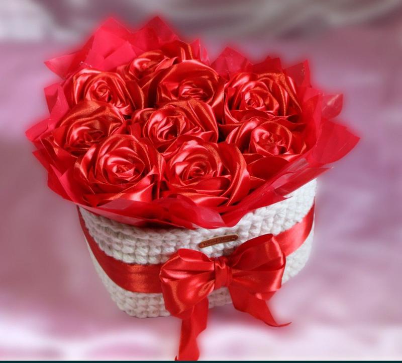 Елегантний кошик у формі серця, ретельно в'язаний з високоякісних нитокі. Усередині кошика розташовані розкішні троянди, майстерно виготовлені з атласної стрічки. Кожна квітка є витвором мистецтва, що імітує натуральну красу свіжих троянд, при цьому додаючи довговічність та відсутність необхідності у догляді. Така композиція стане чудовим доповненням до будь-якого інтер'єру або особливим подарунком для близьких на знаменні події. Цей кошик не лише є прекрасним декором, але й символізує стійкість почуттів та красу, яка не в'яне з часом. Він ідеально підійде для святкування таких подій, як весілля, річниці, дні народження або як вираз ніжних почуттів до когось особливого.