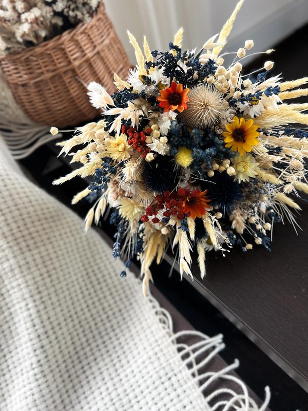 Букет з сухоцвітів і штучних квітів у синьо-жовтих тонах – осінній декор, фотосесія, подар...