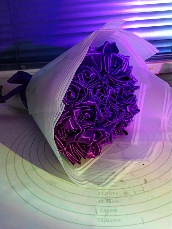 Продається букет з атласної стрічки з 15 троянд колір фіолетовий.Пересилка укр та новою поштою