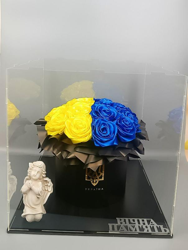 Композиція складається: 1. Акриловий куб 30*30 із чорним дном 2. Чорна коробка із гербом 18*20 3. Кількість троянд 18 шт. 4. Тепер 1шт. 5. Ангелятко 1шт. Букет троянд з атласної стрічки у стильному кубі 30*30 - це пам'ятна композиція, створена з любов'ю та повагою. Такий букет стане символом пошани та вдячності янголу-герою, зберігаючи красу і чистоту на довгі роки. Квіти з атласної стрічки виглядають елегантно, не в'януть та не втрачають кольору довгий час. Композиція у кубі легко встановлюється, підходить для Алеї Слави, меморіальних місць, кладовища чи домашнього вівтаря пам'яті. Переваги композиції: ✅ Довговічні - не потребують догляду ✅ Стильний дизайн у кубі ✅ Символ вічної пам'яті та пошани