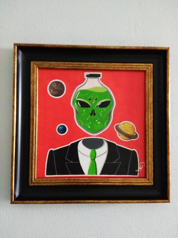 Унікальна авторська картина. В одному екземплярі. "Інопланетне зілля" - це агент, що може "напоїти" собою будь-кого, не відкриваючи пляшки, і довідатися про усе, що хоче почути від співбесідника. Його побічна дія невідома... Акрил, 20×20 см, ДВП, покрита лаком. Рама 27,5*27,5. На створення таких персонажів автора надихають особливі естетичні підбірки (колажі із трьох зображень, які автор об'єднує у щось цілісне)