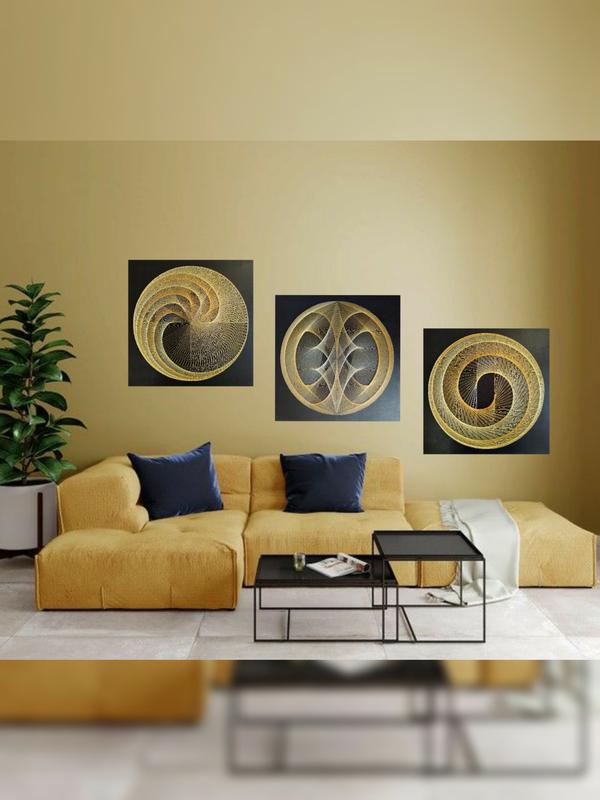 Эти уникальные мандалы, созданные в технике string art, выполнены золотыми нитями на черной доске, что создает эффектный контраст и неповторимость каждого экземпляра. Каждый элемент мандалы создан с большой точностью и вниманием к деталям, что подчеркивает ручную работу и уникальность этого изделия. Мандалы выполнены с использованием принципов и элементов сакральной геометрии, которые в сочетании с техникой String art создают потрясающий 3D-эффект и ощущение глубины. Триптих "Сакральная гиометрия" станет прекрасным украшением вашего интерьера, добавив в него гармонии и элегантности. Это также отличный подарок для ценителей искусства и уникальных вещей. Приобретая это изделие, вы получаете не только прекрасный предмет декора, но и уникальный оберег, который привнесет в ваш дом удачу и благополучие. Эти картины –100% ручной работы. Картина производится на заказ. Время исполнения заказа 5-7 дней. Размер каждой картины 54/54 см. В рамах. Если вам нужен другой размер или цветовая гамма, свяжитесь со мной. Изготовлен из фанеры толщиной 8 мм, покрытой двумя слоями акриловой краски, затем акриловым лаком на водяной основе без запаха. На оборотной стороне есть подвес для крепления картины на стену. Нить для плетения, как правило, капроновая или шелковая. Благодаря таким материалам уход за изделием не сложен.