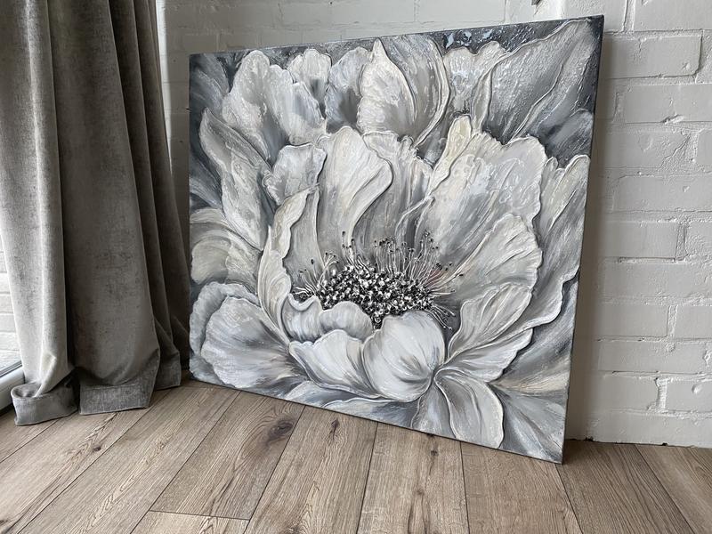 Розкішна глянцева текстурна картина з піоном, має дзеркальний блиск, покрита епоксидною смолою, має виражений рельєф кожної пелюстки. Картина виконана у сучасних техніках живопису, декорована поталлю і декоративним камінням. Стане гідною прикрасою вашого інтерʼєру! Розмір 80х90 см, полотно на підрамнику.