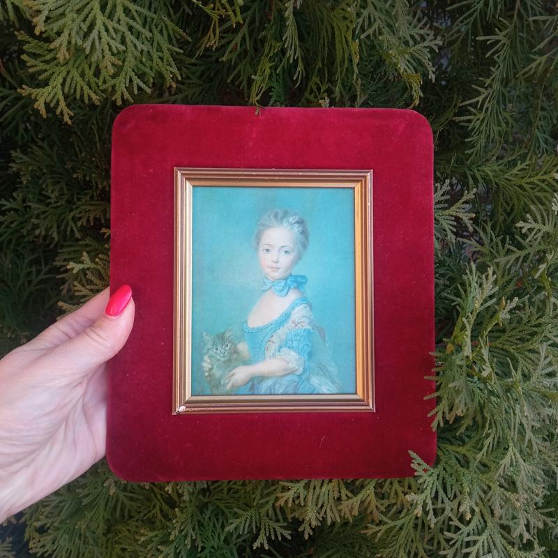 Картина в бархатной раие на деревянной базе,, девочка с котенком,,. англия