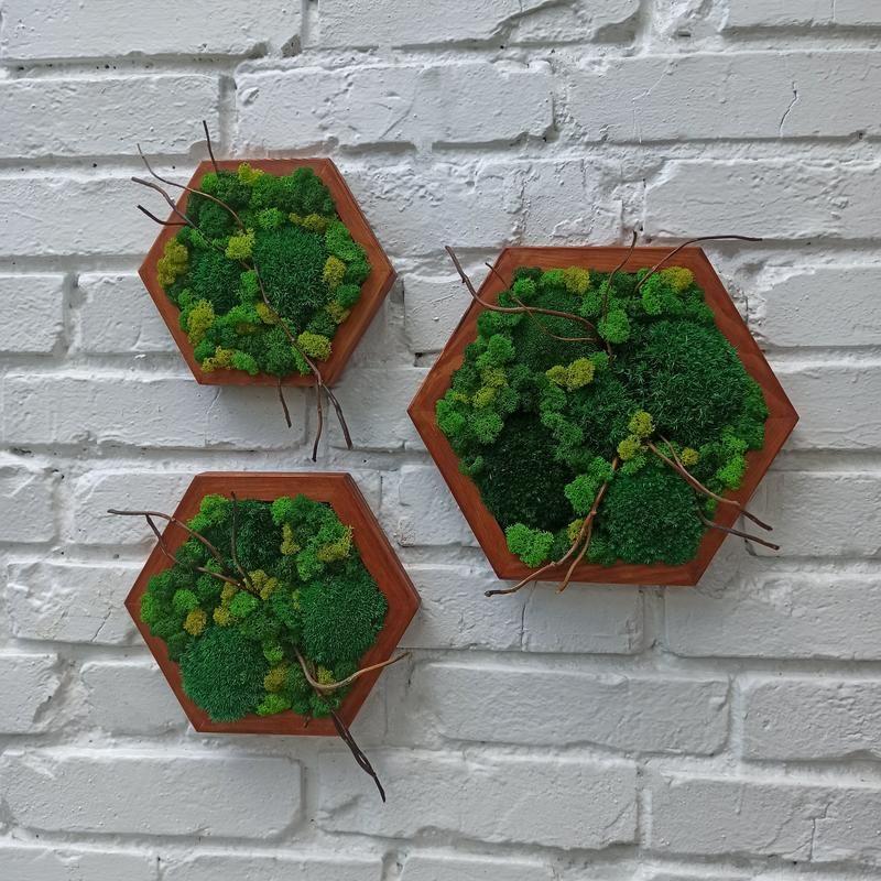 Декор из стабилизированного мха на стену Пропущиваю набор из трех вот таких сот (шестиугольников) разных по размеру: 20*17 см, 20*23 см, 25*29 см Сами соты сделаны из дерева. Высота стено 2,5 см. Толщина 2 см В комплекте крепления, чтобы повесить на стену Соты наполнены двумя видами стабилизированного мха: ягель, кочечный и добавлены тонкие натуральные глочки. Поенано 4 оттенка зеленого мха Мох не теряет свой внешний вид и цвет до 10 лет. Его не нужно поливать. Да такие картины не стоит размещать на солнечной стене, потому что мох ого не любит Расположить такие картины можно как угодно. Некоторые примеры размещения я показала на фото.