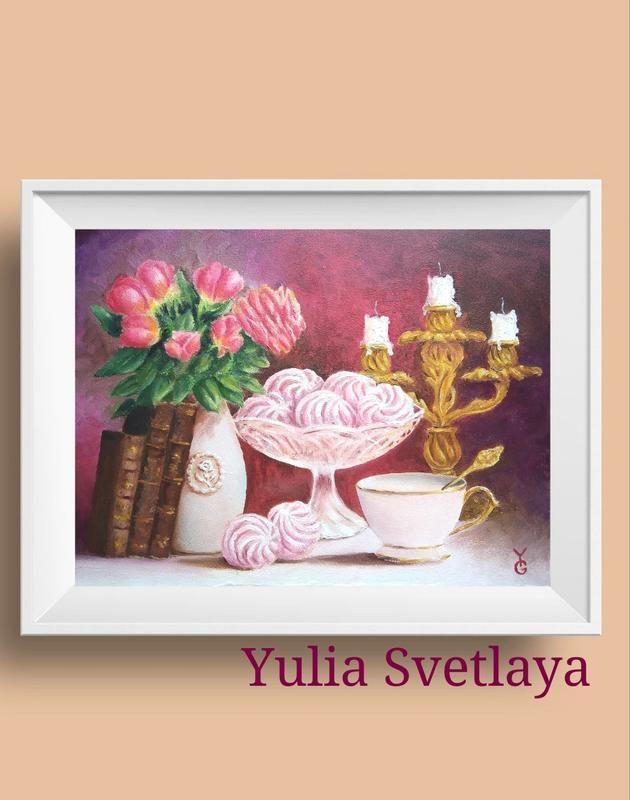 На замовлення! Продана. Можливий повтор. Натюрморт із трояндами, зефіром у важечці, позолоченим свічником, чашкою запашного чаю та кладкою старих книг. Стане окрасою кухні, їдальні, вітальні. Ґрунтований картон 24*30 см, олія. Можливе написання натюрмортів на великих форматах полотні. Товар під замовлення