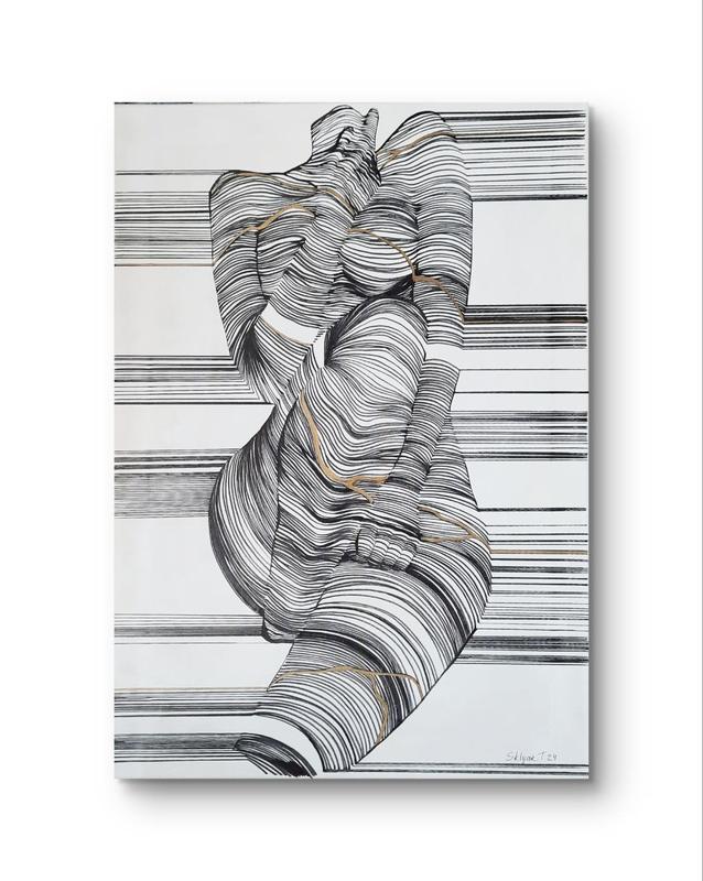 Назва: "Гармонія ліній" Розмір: 50х70 см Матеріали: полотно, акрил Техніка: LineArt Продаж від автора Художник Скляр Тетяна Оформлення: без рами, натягнута на підрамник Картина "Гармонія ліній" - це гра руху і форми, втілена в лаконічних, але виразних чорно-білих лініях. Абстрактний силует людського тіла створений за допомогою плавних вигинів і ритмічних штрихів, які формують об'єм і глибину. Золоті акценти додають тепла та вишуканості, а графічне тло посилює динаміку образу. Ідеально підійде для сучасних інтер'єрів, надаючи простору стилю та унікальності.