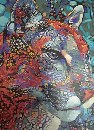 Картина по номерам "Взгляд леопарда", размеры 40 х 50 см. Картина имеет крепления к стене и дважды покрыта глянцевым акриловым лаком, поэтому ее можно протирать даже влажной салфеткой.