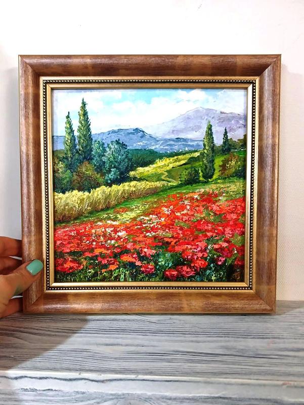 Картина маслом в раме пейзаж цветы "поле с маками" 26х26 см