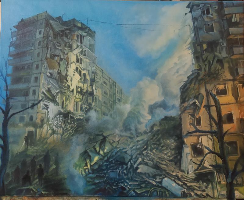 Картина розміром 50 на 40 см, намальована на при кінці 2025 року , олійними фарбами на холсті. Зображує сцену частково зруйнованого багатоквартирного будинку.