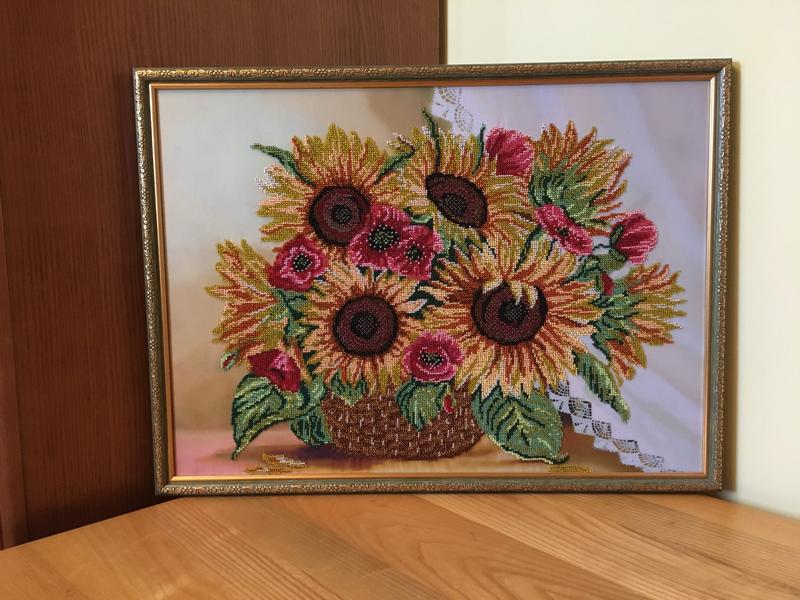 Картина з бісеру «Соняшники в кошику», ручна робота. Розмір 44*59 см {разом з рамкою}