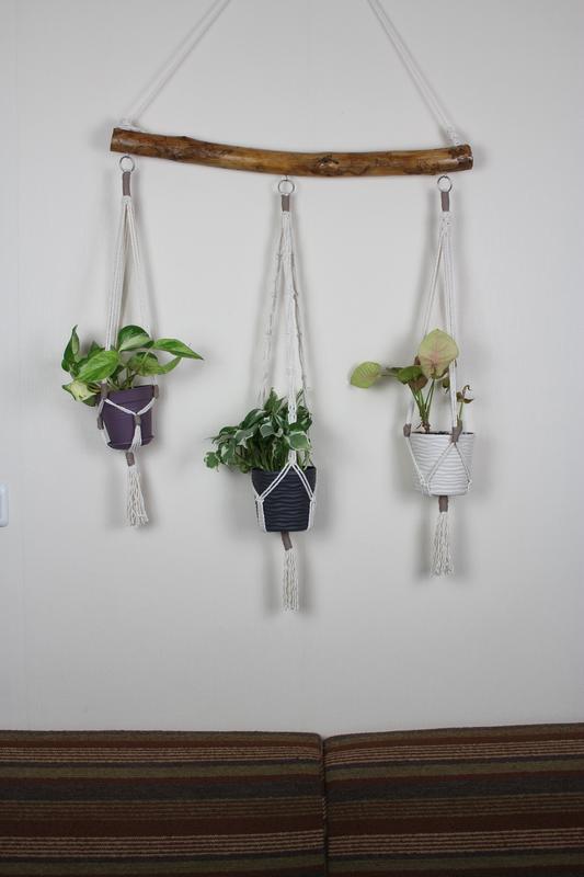 Комплект кашпо в техніці макраме на дерев'яній основі. Дерево сосна, оброблена та покрита лаком. Візерунок на дереві природній. Кашпо кріпляться на гачки, розміщення можна змінювати за бажанням. В комплекті 3 макраме кашпо. Зверху для кріплення основи є кільця. На останніх фото приклади розміщення підвісів.