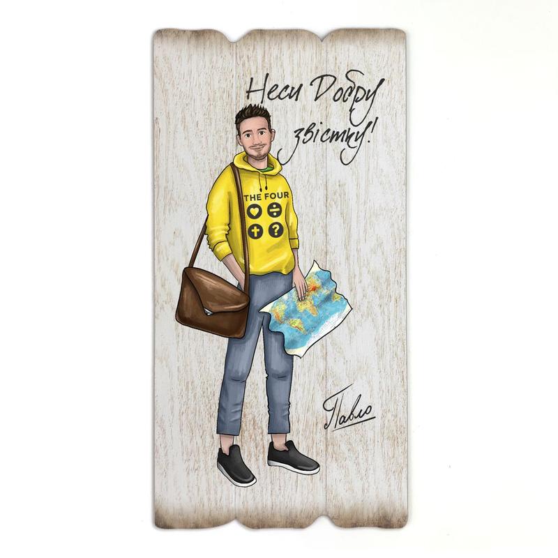 Серія ілюстрацій MyHero (МійГерой) створена нашими партнерами, проєктом MyHero. Головна ідея команди - створення виробів із зображенням біблійних героїв у сучасному вигляді, як би вони жили в наш час. Метою MyHero є донесення думки, що Біблія та її історії актуальні та цікаві завжди, навіть у 21 сторіччі. Давайте надихатися чудовими прикладами біблійних героїв разом! Декоративна табличка з унікальної колекції "MyHero" стані доречним подарунком близьким або ж родзинкою інтер'єру єру вашого будинку. Матеріал - МДФ. Розмір таблички 27,5х14 см. Товщина - 3 мм Має спеціальний гачок для вішання на стіну, а також підставку, щоб розмістити табличку на будь-яку поверхню.