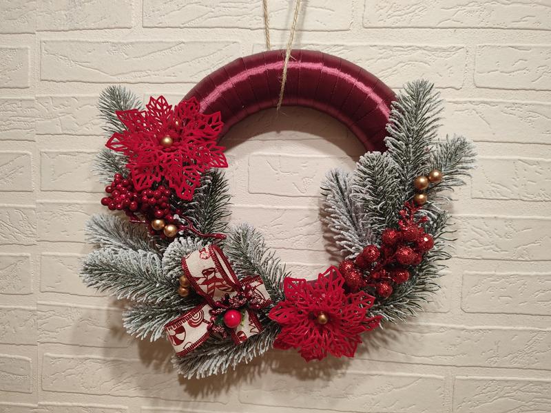 Різдвяна та новорічна декорація на стіну або двері ручної роботи чудова прикраса Вашої оселі або прекрасний оригінальний подарунок для ваших близьких та рідних людей. Діаметр кола без прикрас 24 см., з оформленням 30 - 32 см. також виконую індивідуальні замовлення. В наявності є великий вибір інших прикрас ручної роботи.