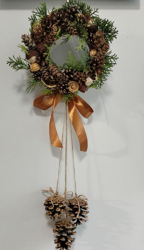 Красивый венчик для украшения праздничного стола или стены. Венок трансформер, поскольку можно украшать стол снимая подвесные шишки или вешать на стену, имеет крепления.