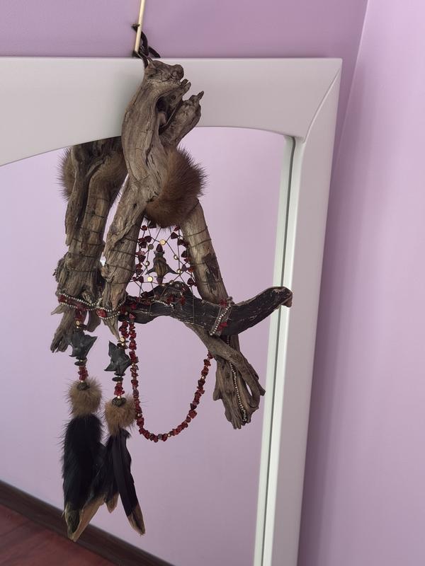Натуральное необработанное дерево, натуральный мех, гранаты, керамические бусины, водный орех, перья. Замеры 25/39/27 в единственном экземпляре